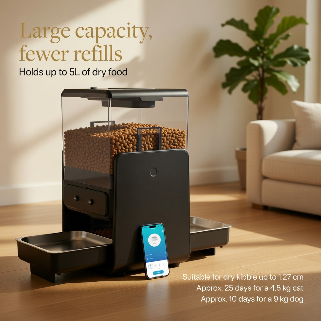 The TailPlay Smart Feeder Duo – 5L is made for pet owners who want a smoother, more reliable feeding routine at home. With its generous 5L capacity and dual-bowl layout, it is especially well suited for two-cat households and other small pets that benefit from a more structured mealtime setup.